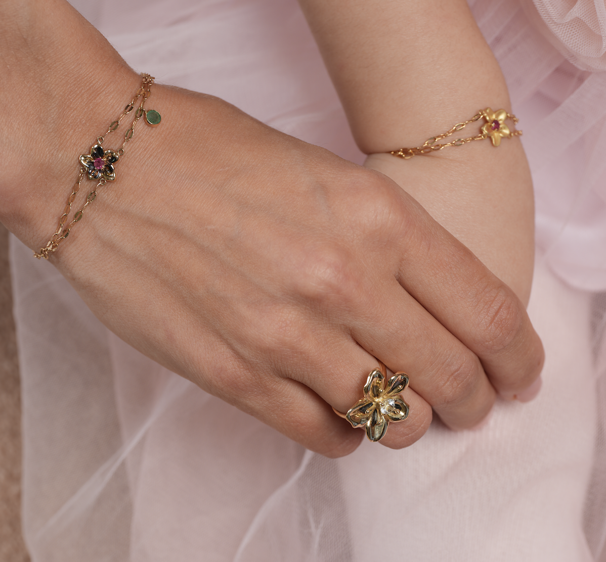 SKU: PER-BB-18KY-TOU DESCRIPTION: Baby Periwinkle Bracelet TYPE: Baby Bracelet COLLECTION: Periwinkle GOLD: 18 Karat yellow gold GEMSTONES: Pink Tourmaline TOTAL WEIGHT (excluding beads): 2.30 grams GEM WEIGHT (excluding beads) Approx.: 0.08 Carats