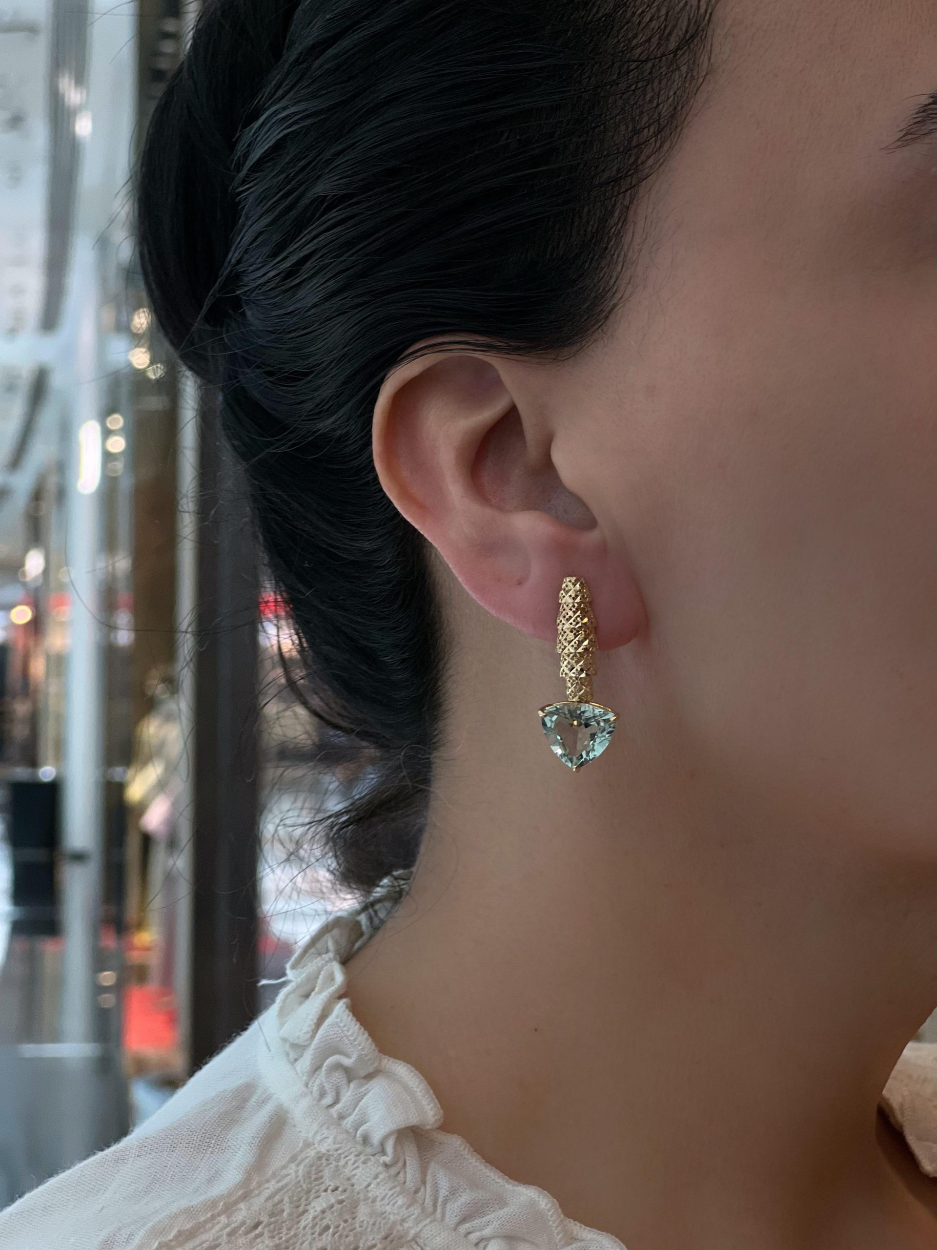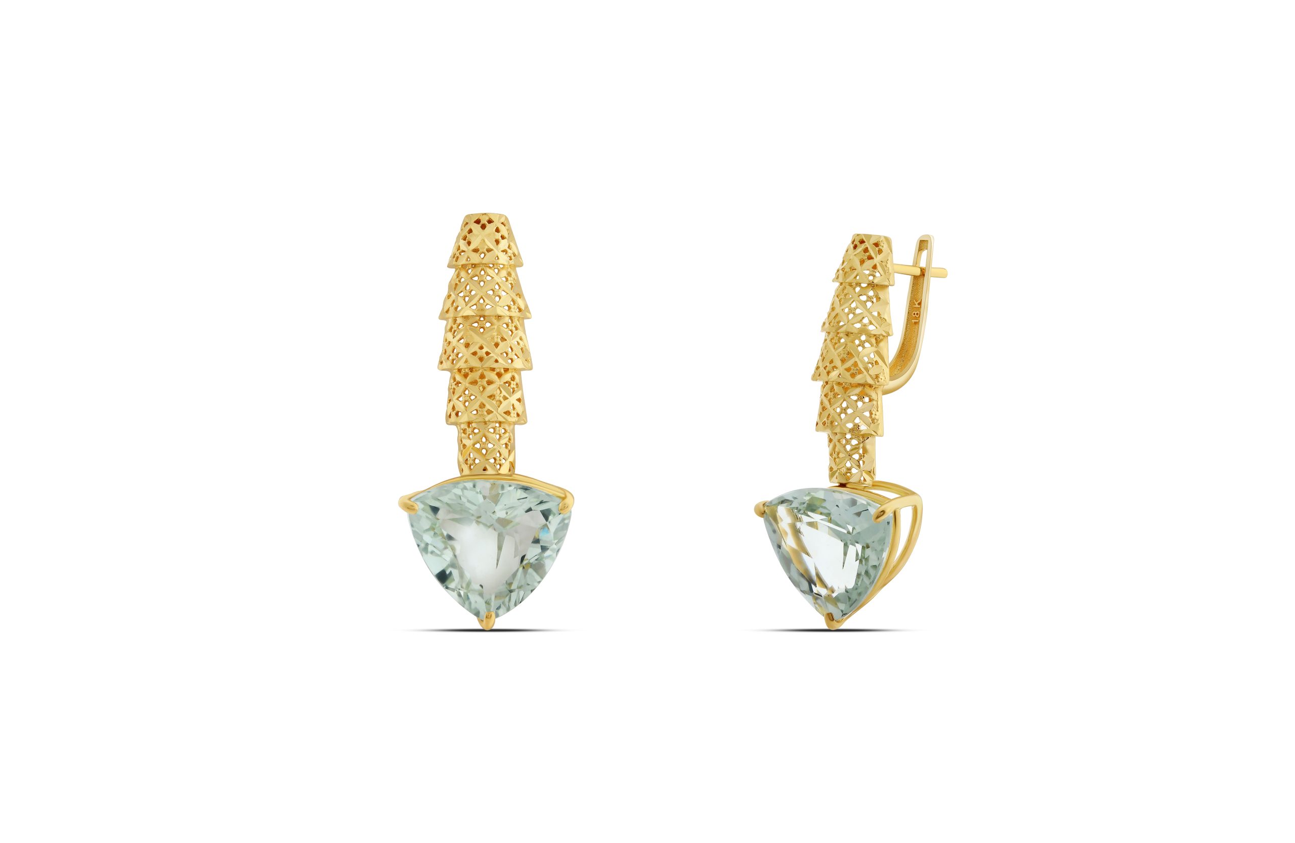 SKU: PAL-EAR-18KY-PRA DESCRIPTION: Yellow Gold Palm Earrings COLLECTION: PALM GOLD: 18 Karat yellow gold GEMSTONES: Prasiolite Trillion Cuts. TOTAL WEIGHT: 8.27 grams GEM WEIGHT: 10.30 Carats